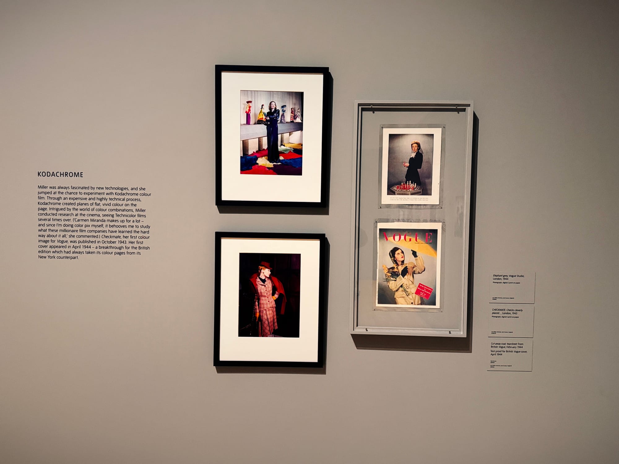 One wall text in particular stopped me: the section on Kodachrome. Miller leapt at new technologies, embracing the vivid, technical challenges of early colour film. She conducted her own research by repeatedly testing Technicolour films, pulling apart colour theory, and understanding how light behaves when asked to tell a new kind of story.